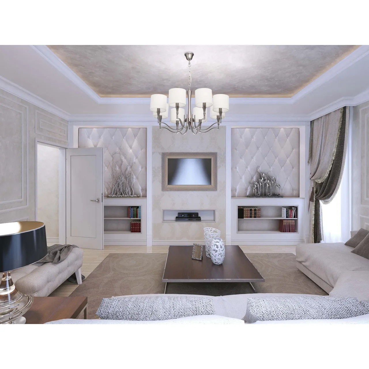Металлическое основание цвета сатинового никеля. Абажуры -текстиль сливочного цвета